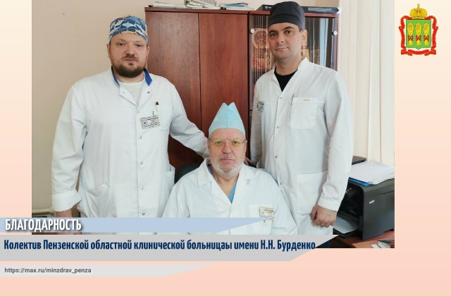 «Обращаюсь к вам с искренней благодарностью и глубокими словами признательности в адрес медицинских работников Пензенской областной клинической больницы имени Н. Н. Бурденко, - поступило обращение со словами искренней благодарности в Министерство здравоохранения Пензенской области от родственника пациентки Марии Николаевны С. – Спасибо заведующему хирургическим отделением №3 Слепченко Владимиру Леонидовичу, успешно выполнившего операцию, а врачу-хирургу Макарову Антону Григорьевичу и заведующему отделением анестезиологии-реанимации №1 Юцмюц Алексею Адольфовичу!