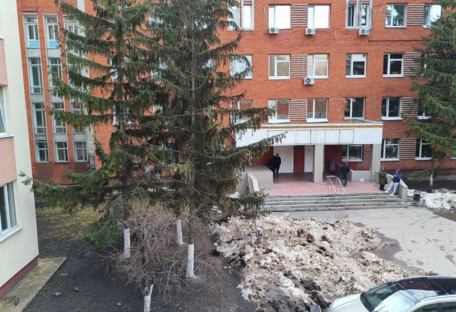 Зима постепенно сдает свои позиции, и на территории областной больницы кипит работа по наведению порядка после снежных баталий.