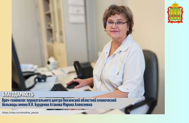 «От всего сердца хотелось бы выразить слова искренней благодарности врачу-гинекологу перинатального центра Пензенской областной клинической больницы им. Н.Н. Бурденко Атановой Марине Алексеевне за необыкновенно чуткое и доброе отношение к пациентам, это не только мое мнение. Посещение врача-гинеколога-это всегда внутреннее напряжение и немного страх, но Марине Алексеевне удалось найти правильные слова для меня. А следующий раз я пойду на прием как к родному человеку. Вот бы все врачи были такими! Я надеюсь, что у нас с доктором все получится и моя мечта осуществится! Спасибо за работу! Здоровья!», - поступило обращение со словами искренней благодарности в Министерство здравоохранения Пензенской области от пациентки Д.Т.