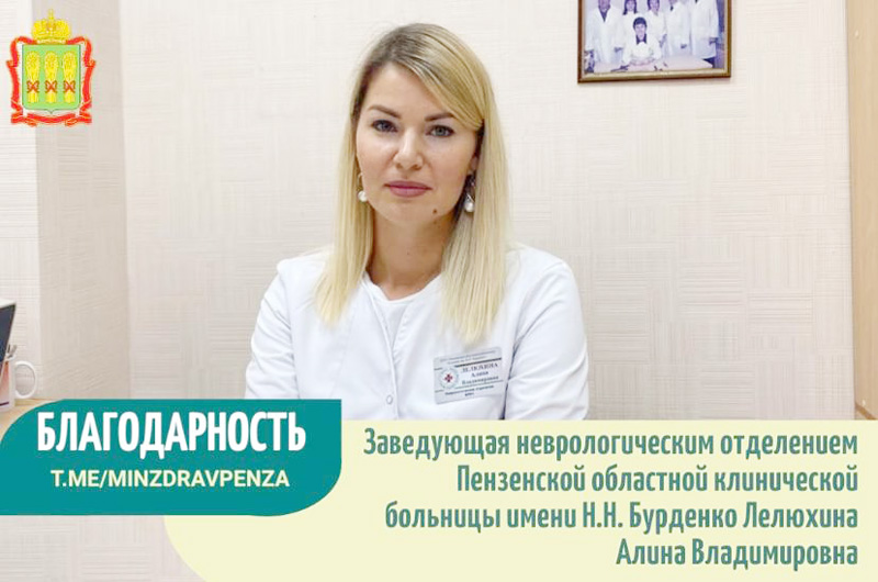 «Хочу выразить искреннюю благодарность заведующей неврологическим отделением Пензенской областной клинической больницы имени Н.Н. Бурденко Лелюхиной Алине Владимировне. Это врач с большой буквы! Всегда придет на помощь. Спасибо за Ваш профессионализм и отзывчивость! Желаю успехов в работе и всего самого доброго!»