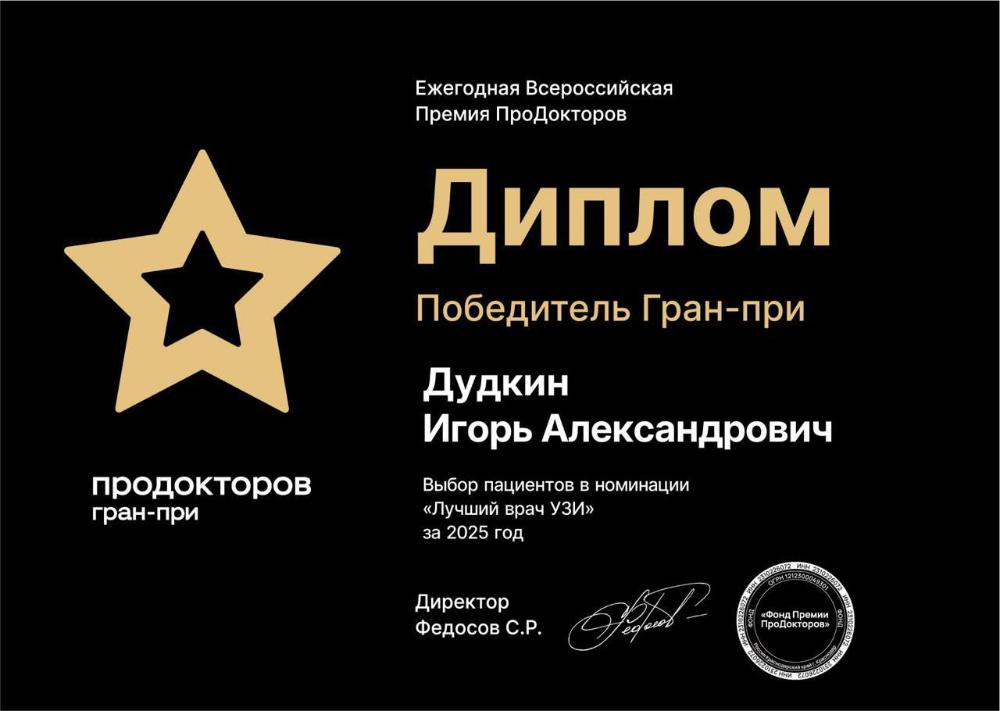 В 2025 году победителем Гран-при в номинации Врач УЗИ стал врач из Пензы ДУДКИН Игорь Александрович - врач УЗИ-диагностики перинатального центра Пензенской областной клинической больницы им. Н. Н. Бурденко.