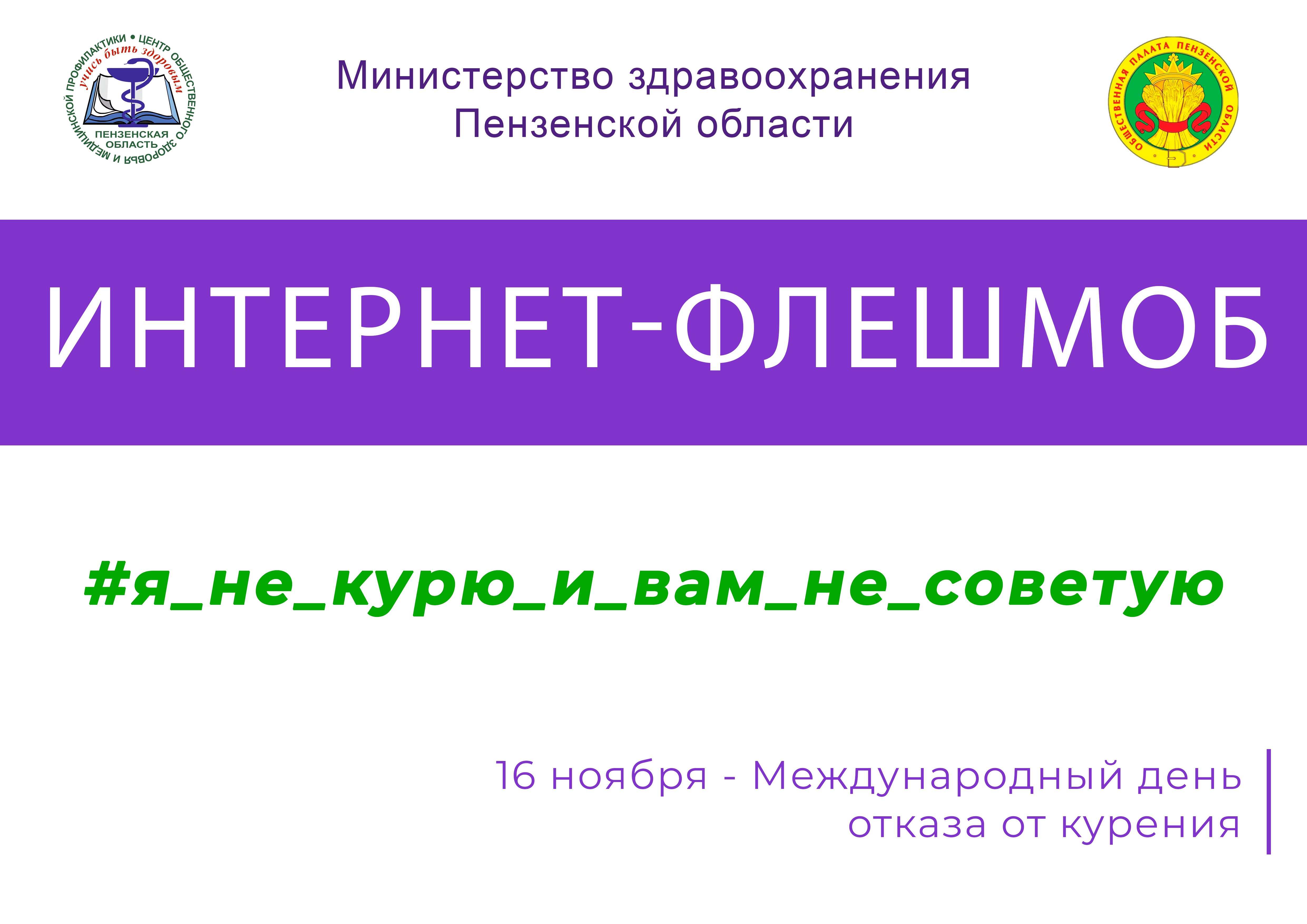 В преддверии значимой даты, которая в этом году выпадает на 16 ноября, в Пензенской области стартует флешмоб в социальных сетях #Я_НЕ_КУРЮ_И_ВАМ_НЕ_СОВЕТУЮ, инициатором которого стало Министерство здравоохранения Пензенской области.
