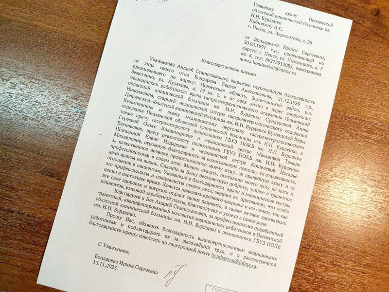 Благородим и Вас Андрей Станиславович, за профессионально подобранный грамотный, квалифицированный коллектив медицинских работников в Пензенской областной клинической больницы им. Н.Н. Бурденко.