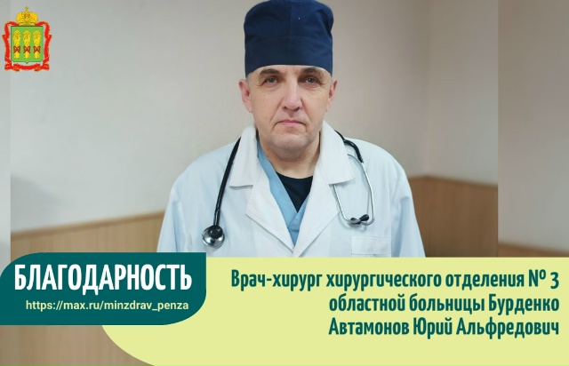 «Хотелось бы выразить благодарность врачу-хирургу хирургического отделения № 3 Пензенской областной клинической больницы имени Н.Н. Бурденко Автамонову Юрию Альфредовичу за проведенную в октябре 2025 года операцию в моем непростом случае. Благодаря его высокому профессионализму послеоперационное восстановление было эффективно, несмотря на осложнения.