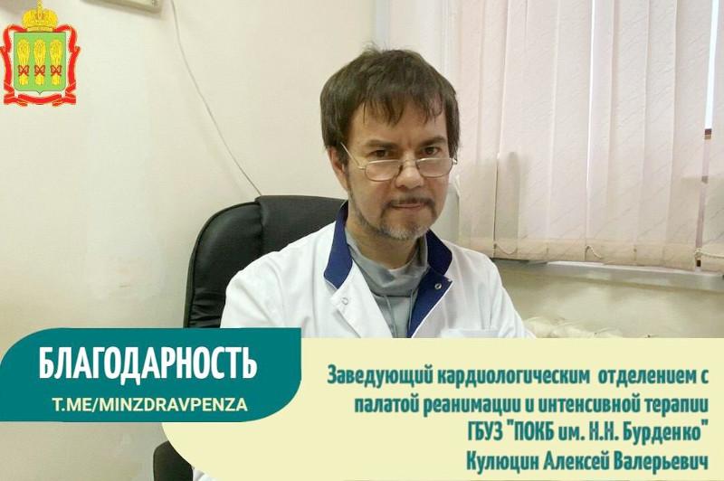 «Хочу выразить огромную благодарность и низкий поклон заведующему кардиологическим отделением Пензенской областной клинической больницы имени Н.Н. Бурденко Кулюцину Алексею Валерьевичу и моему лечащему врачу кардиологу Ильясовой Евгении Александровне.