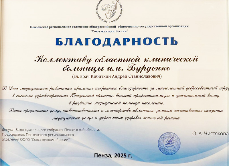 Пензенское региональное отделение общероссийской общественно-государственной организации «Союз женщин России» отметило благодарностью коллектив областной клинической больницы им. Бурденко под руководством главного врача Кибиткина Андрея Станиславовича.