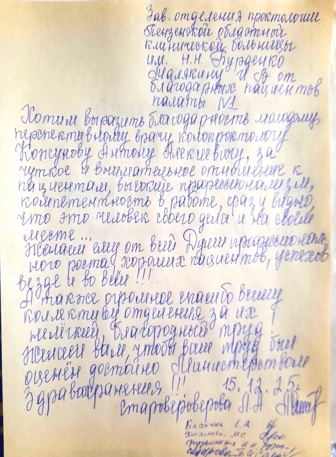 Данная благодарность поступила личным сообщение в группу областной больницы им. Н.Н Бурденко в Одноклассники. Фото прилагается. Благодарим за тёплые слова!