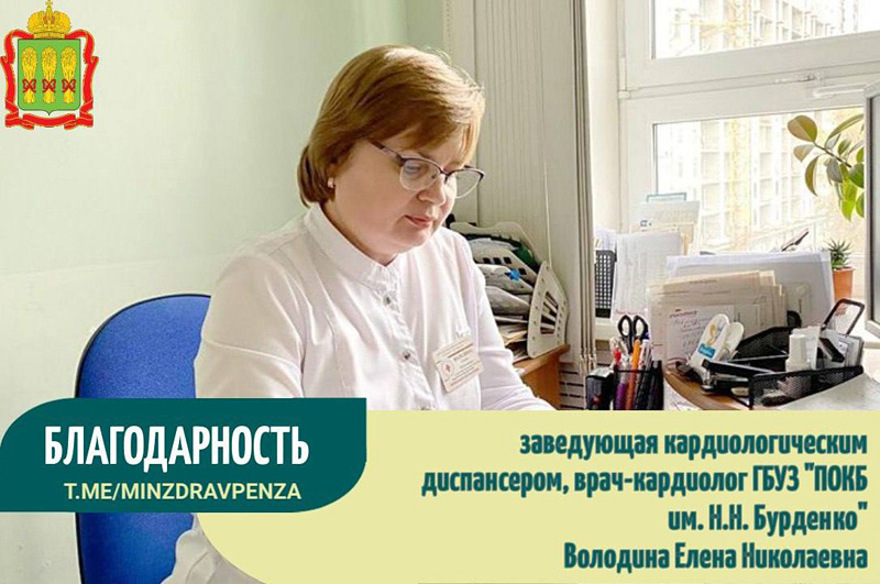 Хочу выразить благодарность врачу-кардиологу Пензенской областной клинической больницы имени Н.Н. Бурденко Володиной Елене Николаевне за чуткое отношение к пациентке, за разъяснение по поводу диагноза, за коррекцию лечения!